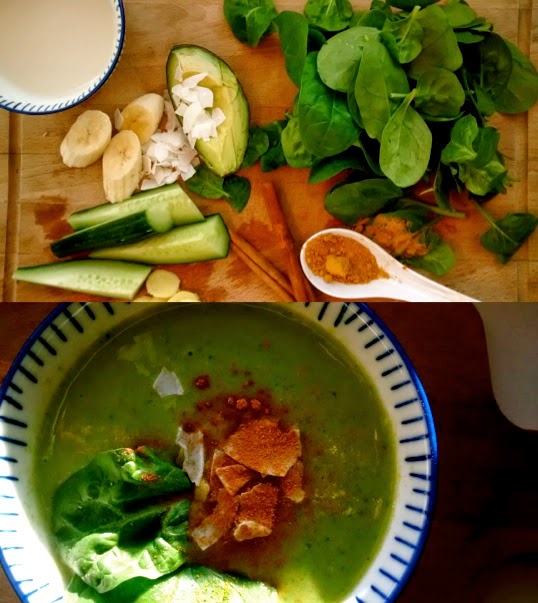 Mix all ingredients in a blender until smooth. If it feels too thick add more liquid. It might take a while until you get used to this unusual taste. Feel free to play around with the ingredients and adjust depending on personal tastes. I usually add some nut milk, pears, raisins, ground vanilla or agave to give a flavourful sweet touch. By now the green juice is a recipe I irreversibly incorporated in my breakfast selection. I regard it as a wonderful choice for monday mornings and thank the beautiful island of Bali for inspiring me.