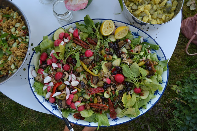 Last year, I contributed this vegan black bean cake by the inspiring greenkitchenstories. This year, I prepared a messy salad with antipasti.