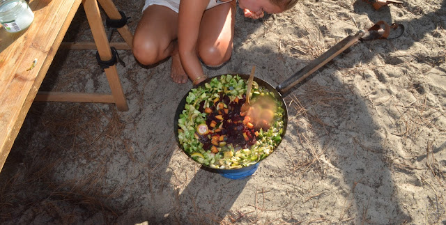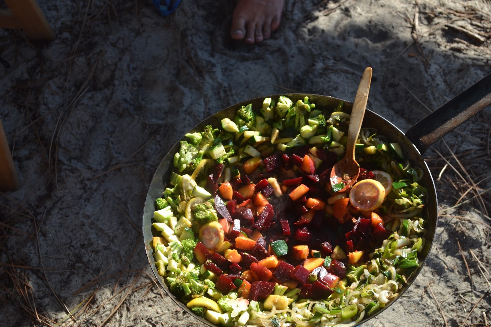 These rainbow colors and sounds of summer put me in a melancholic mood and make me dream of warmer days. I also love the simplicity in preparation. All we had was: One knife, one spoon, one (admittedly giant) pan, a table and a camping stove. Everything was about the ingredients only and not about the nature of preparation. Every day we came up with a new version of this ’single pan dish‘ and enjoyed the variety in simplicity.