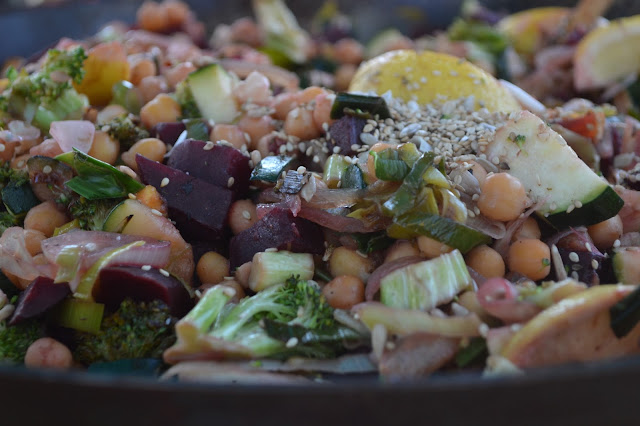 As I said above, preparation is truly simple: wash the veggies, cut them into pieces and then throw them one after the other into the pan. If you own a pan which is as large as the one we used on holiday, you can use it for the entire meal. If not, you might need to use several smaller pans. Apart from the leek, every ingredient in this recipe can be consumed raw (if you use precooked chickpeas). That is why I started with roasting the leek and onions in coconut oil. Add all the other vegetables and fruit, season with salt and chili, mix until well combined and everything is warmed up.